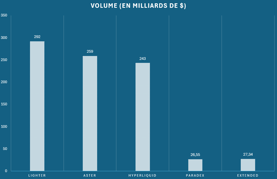 À la lecture brute des chiffres, Lighter et Hyperliquid dominent clairement le secteur, concentrant l’essentiel de l’activité.