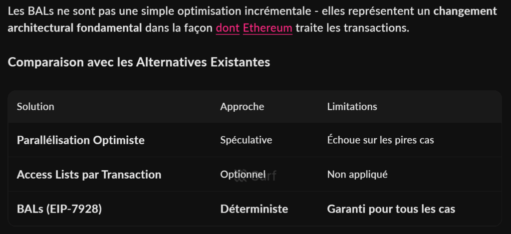 Enfin, les BAL optimisent la phase finale de validation en permettant le calcul parallèle de la racine d’état (State Root). Au lieu d’attendre que toutes les transactions d’un bloc soient terminées pour mettre à jour l’état global de la blockchain, les nœuds utilisent les informations contenues dans les BAL pour anticiper et calculer les modifications en temps réel. Cette réduction du travail post-exécution permet de valider et de propager les blocs beaucoup plus rapidement, fluidifiant ainsi l’ensemble du réseau.