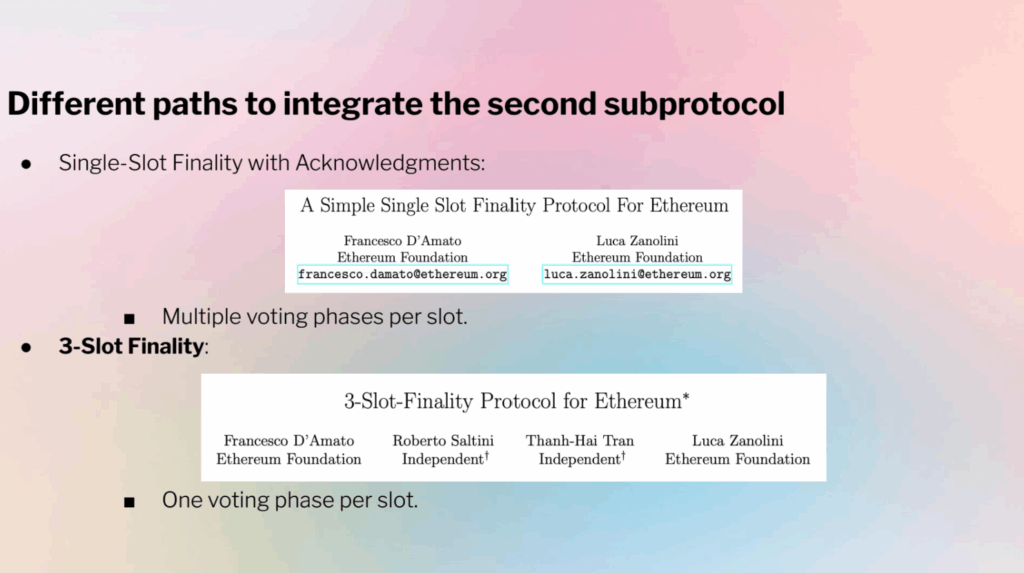 Parallèlement à la fréquence des blocs, la recherche s’intensifie sur la réduction du temps de finalité sur le Layer 1. Des projets majeurs tels que la Single Slot Finality (SSF) et la 3-slot finality sont à l’étude pour permettre aux transactions d’atteindre un état d’irréversibilité après 12 ou 18 secondes.