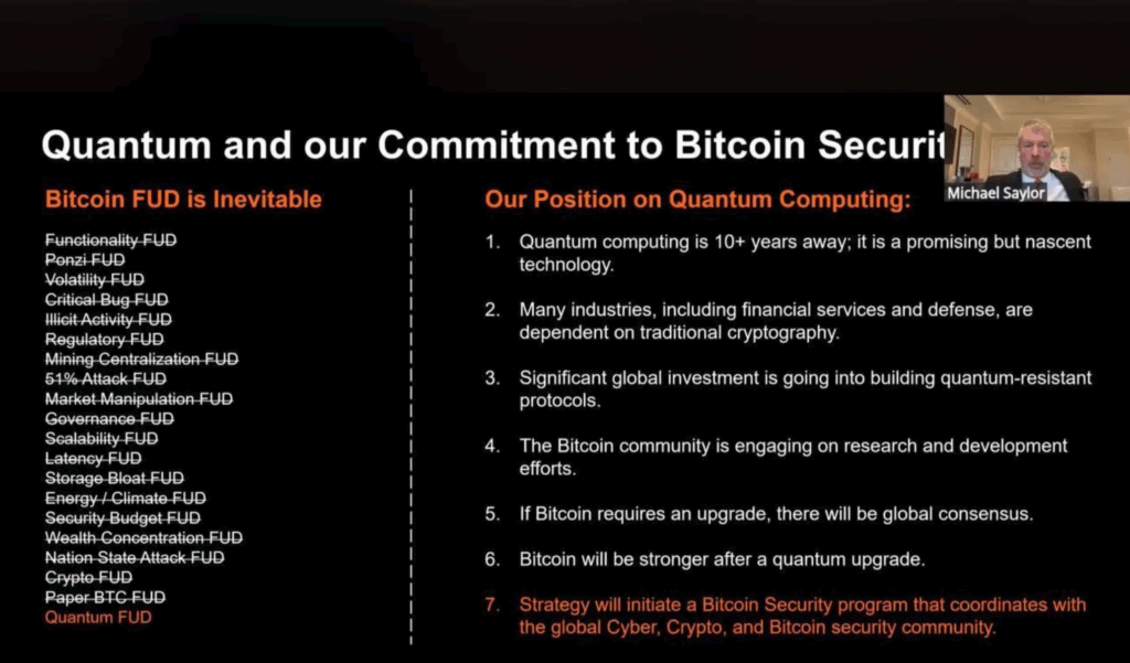 - Michael Saylor replace le risque quantique dans l’histoire du FUD Bitcoin, tout en appelant à une préparation collective via la recherche open source.
