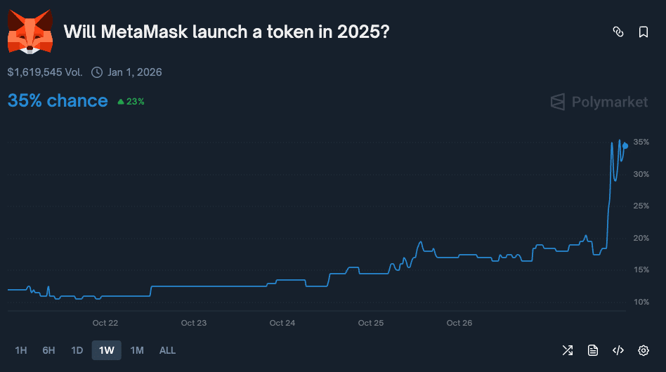 Le marché crypto s’enflamme une nouvelle fois autour de MetaMask. Un site baptisé claim.metamask.io vient d’apparaître en ligne, faisant exploser les paris sur Polymarket : les chances de voir le lancement du tant attendu token MASK avant la fin de l’année sont passées à 35 % en quelques heures.