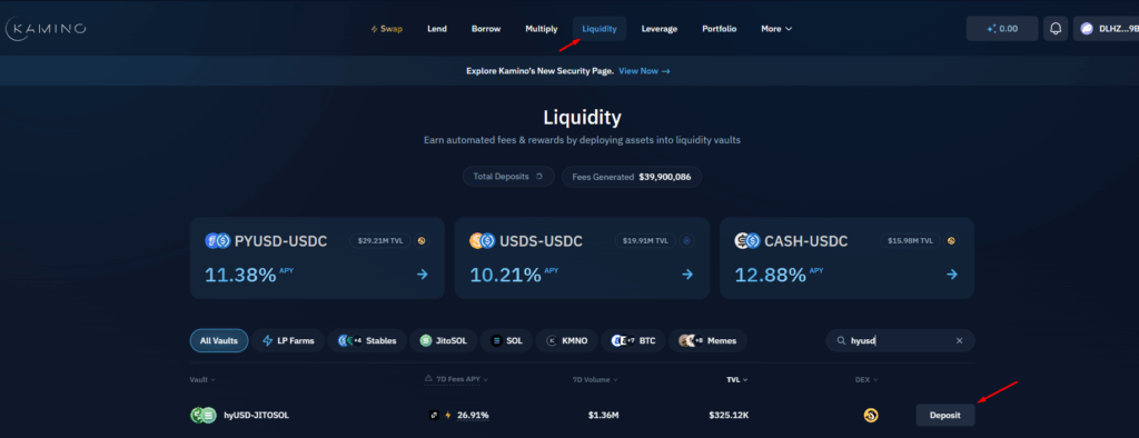 Pour déposer vos actifs, accédez à la plateforme Kamino, connectez votre wallet Solana, puis rendez-vous dans l’onglet « Liquidity. Recherchez ensuite la paire « hyUSD-jitoSOL » afin d’y déposer vos liquidités.
