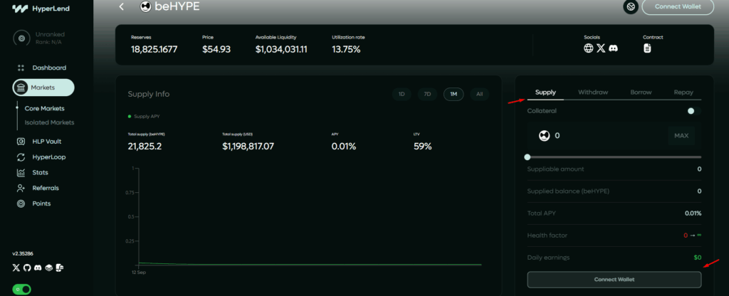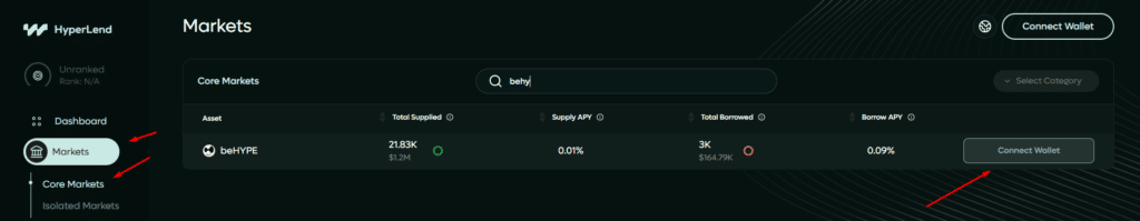 Si vous souhaitez farmer Hyperbeat tout en profitant des opportunités offertes par une autre plateforme, déposer vos jetons $beHYPE sur Hyperlend peut représenter une stratégie pertinente. Cela vous permet en effet de cumuler des Hearths sur Hyperbeat, tout en gagnant simultanément des points sur Hyperlend, ce qui optimise votre rendement global. Pour cela, rendez-vous sur la plateforme Hyperlend, connectez votre wallet sur le réseau HyperEVM, puis accédez à la section « Core Markets », disponible dans l’onglet « Markets ». Recherchez ensuite le jeton $beHYPE et cliquez sur « Deposit« .