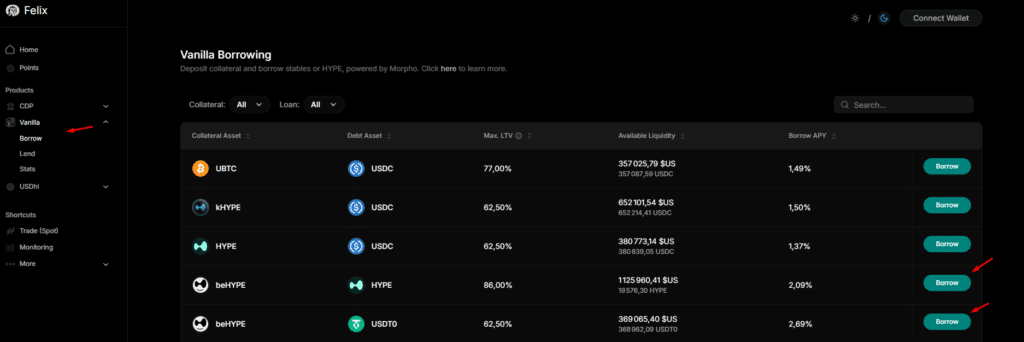 L’un des atouts majeurs de Felix réside dans la possibilité d’utiliser vos jetons $beHYPE comme collatéral pour emprunter d’autres actifs, tels que $HYPE ou $USDT0. Cela vous permet de conserver une partie de votre capital sous forme liquide, tout en restant exposé à l’écosystème. Pour ouvrir ce type de position, rendez-vous sur la plateforme Felix, connectez votre wallet au réseau HyperEVM, puis accédez à l’onglet « Borrow », situé dans la section « Vanilla ».