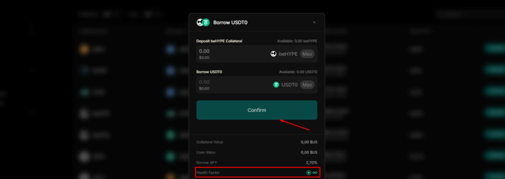 Sélectionnez ensuite l’option « Borrow » correspondant à l’actif que vous souhaitez emprunter. Indiquez le montant de $beHYPE que vous souhaitez utiliser en tant que collatéral, puis précisez la quantité de jetons que vous souhaitez emprunter. Prenez soin d’évaluer votre Health Factor afin de limiter les risques de liquidation. Une fois les paramètres définis, cliquez sur « Confirm » puis validez les transactions directement depuis votre wallet.