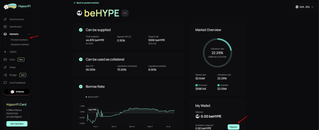 Si vous cherchez une autre option pour faire fructifier vos jetons $beHYPE tout en cumulant à la fois des Hearts et des points sur une seconde plateforme, HypurrFi constitue également une alternative intéressante. Le protocole vous permet de déposer vos jetons pour les faire travailler dans un environnement optimisé multi-récompenses. Pour cela, rendez-vous sur la plateforme HypurrFi, connectez votre wallet au réseau HyperEVM, puis accédez à l’onglet « Pooled Markets » dans la section « Markets ». Recherchez le jeton $beHYPE, cliquez sur « Deposit », entrez le montant à déposer, puis confirmez à nouveau avec le bouton « Deposit ». Il ne vous reste plus qu’à valider la transaction sur votre wallet pour finaliser l’opération et activer votre farming de points sur les deux protocoles.