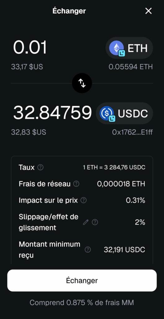 Pour réaliser un échange, cliquez sur le bouton “Trader”, puis sélectionnez “Échanger”. Choisissez ensuite le jeton et le réseau que vous souhaitez utiliser, indiquez le montant de votre transaction, puis sélectionnez le réseau de destination ainsi que le jeton à recevoir. Il ne vous reste plus qu’à cliquer sur “Échanger” et à valider la transaction pour lancer le swap.