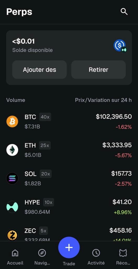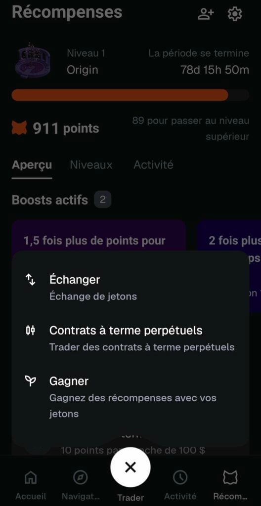 Ouvrir, fermer ou exécuter une position Perps sur Metamask permet de gagner 1 point pour chaque tranche de 10 $ de valeur de position. Pour accéder à cette fonctionnalité, rendez-vous dans la section “Contrats à terme perpétuels”, disponible depuis l’onglet “Trade” de l’application.