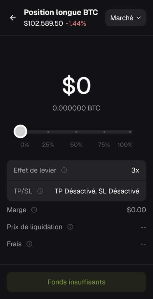 Cliquez ensuite sur le jeton sur lequel vous souhaitez ouvrir une position, puis sélectionnez “Position longue” ou “Position courte” selon le type d’exposition que vous désirez prendre. Choisissez le type d’ordre à exécuter, marché pour une exécution immédiate ou limite pour une entrée à un prix précis, puis indiquez la taille de votre position en précisant le montant du collatéral ainsi que le levier souhaité. Vous pouvez également ajouter des niveaux de take-profit (TP) et stop-loss (SL) si vous le souhaitez, avant de cliquer sur “Ouvrir la position” afin de placer votre ordre.