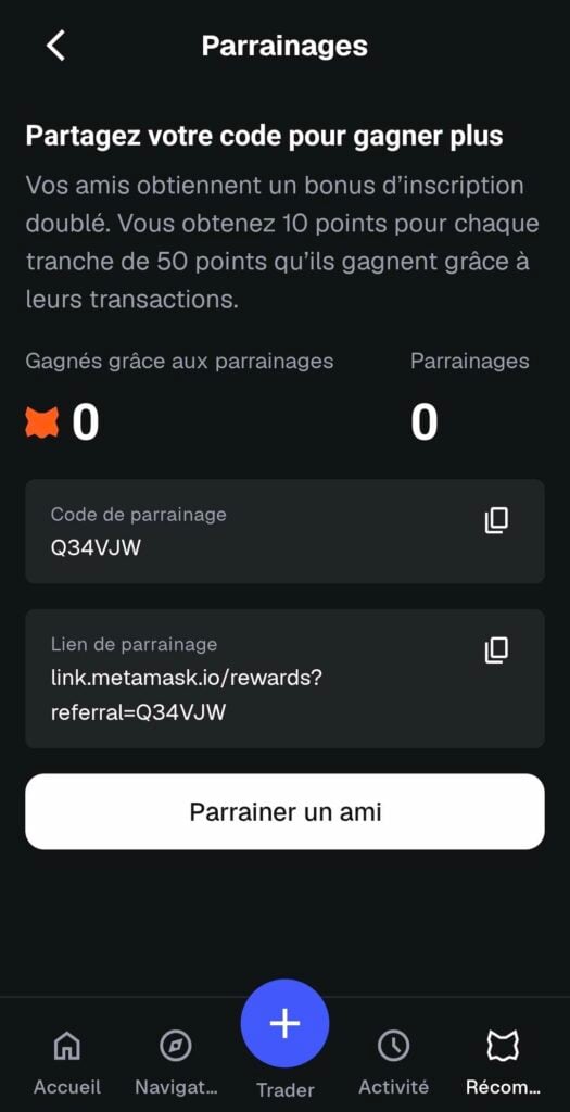 Pour inviter des utilisateurs, cliquez simplement sur “Parrainez des amis” depuis l’onglet “Rewards” et partagez votre lien d’invitation. Depuis cette même page, vous pourrez suivre le nombre d’utilisateurs ayant rejoint le programme Metamask Rewards grâce à votre lien, ainsi que les points que vous avez accumulés grâce à leurs activités.