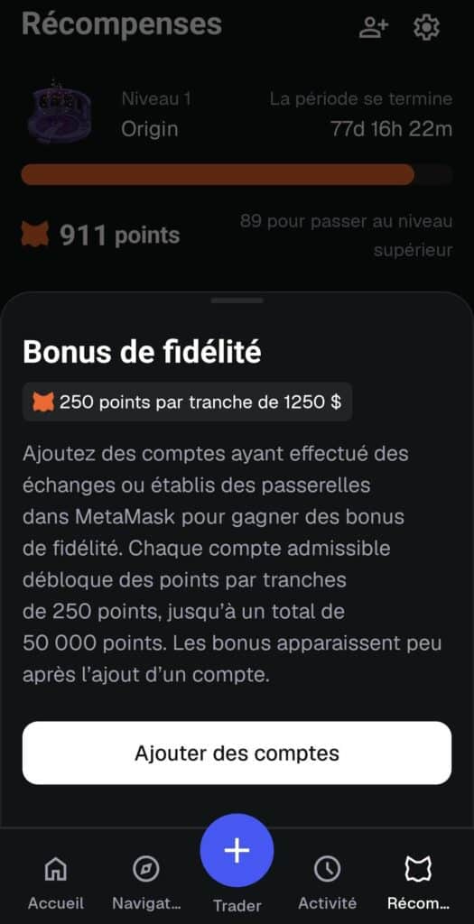 Il est également possible de lier plusieurs comptes Metamask afin de cumuler plus rapidement les points et d’atteindre les niveaux supérieurs. Certaines récompenses, comme les boosts ou réductions de frais, sont appliquées automatiquement, tandis que d’autres, notamment les allocations de tokens, seront distribuées à la fin de la saison durant une période de claim dédiée.