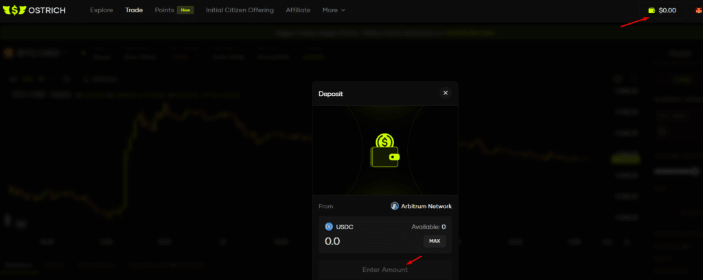 Vous devrez ensuite déposer des jetons $USDC sur votre portefeuille Ostrich depuis le réseau Arbitrum afin de pouvoir ouvrir des positions. Pour cela, cliquez sur votre portefeuille en haut de l’interface, indiquez le montant à déposer, cliquez sur « Deposit », puis validez les transactions directement depuis votre wallet.