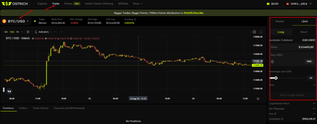 Pour l’instant, le fonctionnement de Ostrich reste volontairement simple et accessible. La plateforme permet aux utilisateurs d’ouvrir des positions sur un large éventail d’actifs, allant des cryptomonnaies aux actions américaines, en passant par le Forex, les indices ou encore les métaux. À chaque trade effectué, le volume généré est pris en compte dans le calcul des Ostrich Points, qui déterminent votre part de l’airdrop à venir.