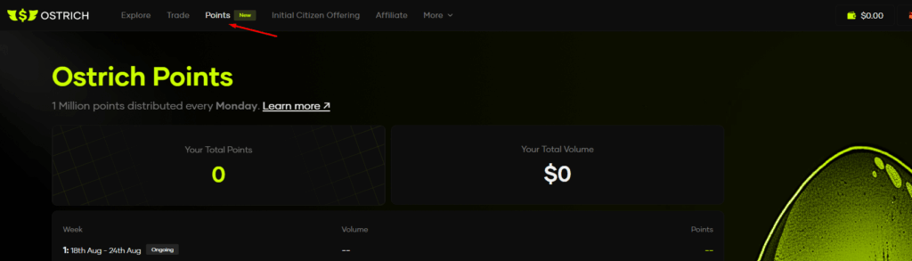 Pour espérer recevoir une allocation lors du futur airdrop de Ostrich, il est essentiel de participer au programme de points mis en place par la plateforme. Ce système de récompense s’étale sur une période de 8 semaines, pendant laquelle 1 million de points sont distribués chaque semaine en fonction de l’activité de trading des utilisateurs.