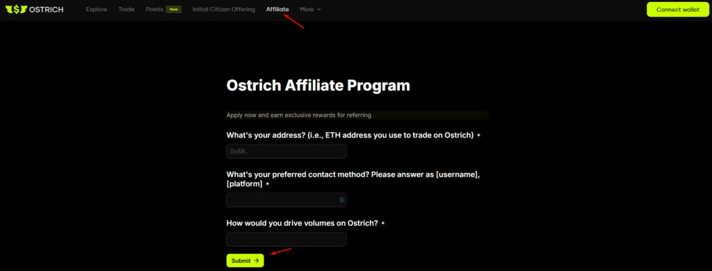 Il est courant que les plateformes utilisant un système de points mettent en place un programme d’affiliation, permettant aux utilisateurs actifs de parrainer de nouveaux venus. En échange, ils perçoivent une commission sur les points générés par leurs filleuls, voire une part des frais de trading associés. Ostrich propose ce type de programme, mais son accès est limité : vous devez d’abord soumettre une demande.