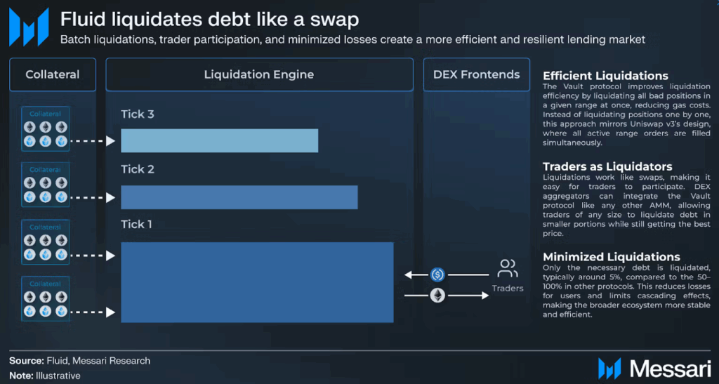 Le protocole regroupe les positions dans des plages de ratio dette/collatéral, appelées “ticks”. Lorsqu’une limite est franchie, toutes les positions d’un même intervalle peuvent être liquidées en une seule transaction.
