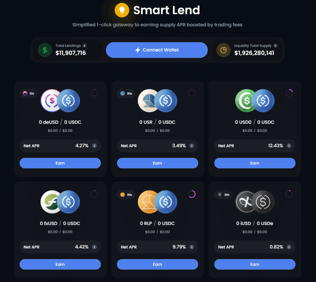 Ces dépôts génèrent un rendement issu de l’activité de prêt, des positions de vault et des frais du DEX. Les parts du pool sont tokenisées sous la norme ERC-4626, ce qui simplifie leur intégration dans d’autres protocoles et agrégateurs de rendement.