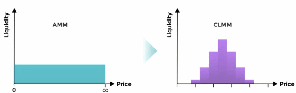 Ce système reprend le fonctionnement des AMM classiques mais le rend plus précis. Dans un AMM traditionnel, la liquidité est répartie uniformément sur toute la courbe de prix.