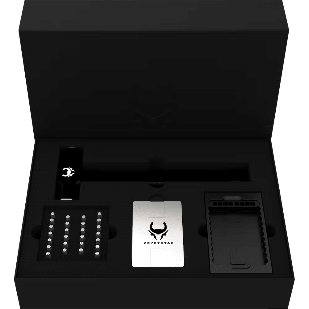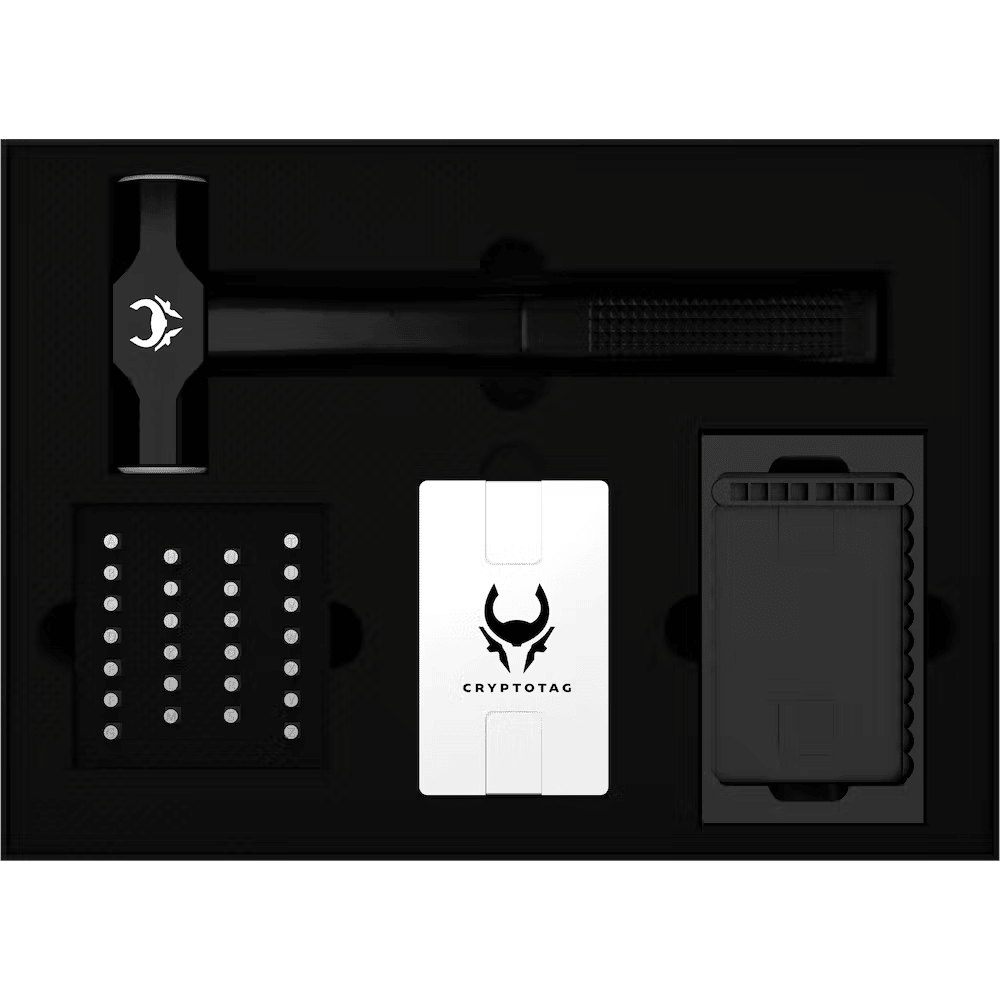 Le Thor est un grand garçon et est livré dans une boîte de 3,6kg/7,9lb qui comprend tout ce dont vous avez besoin pour graver votre phrase de semence dans les plaques de titane de 6mm d’épaisseur.